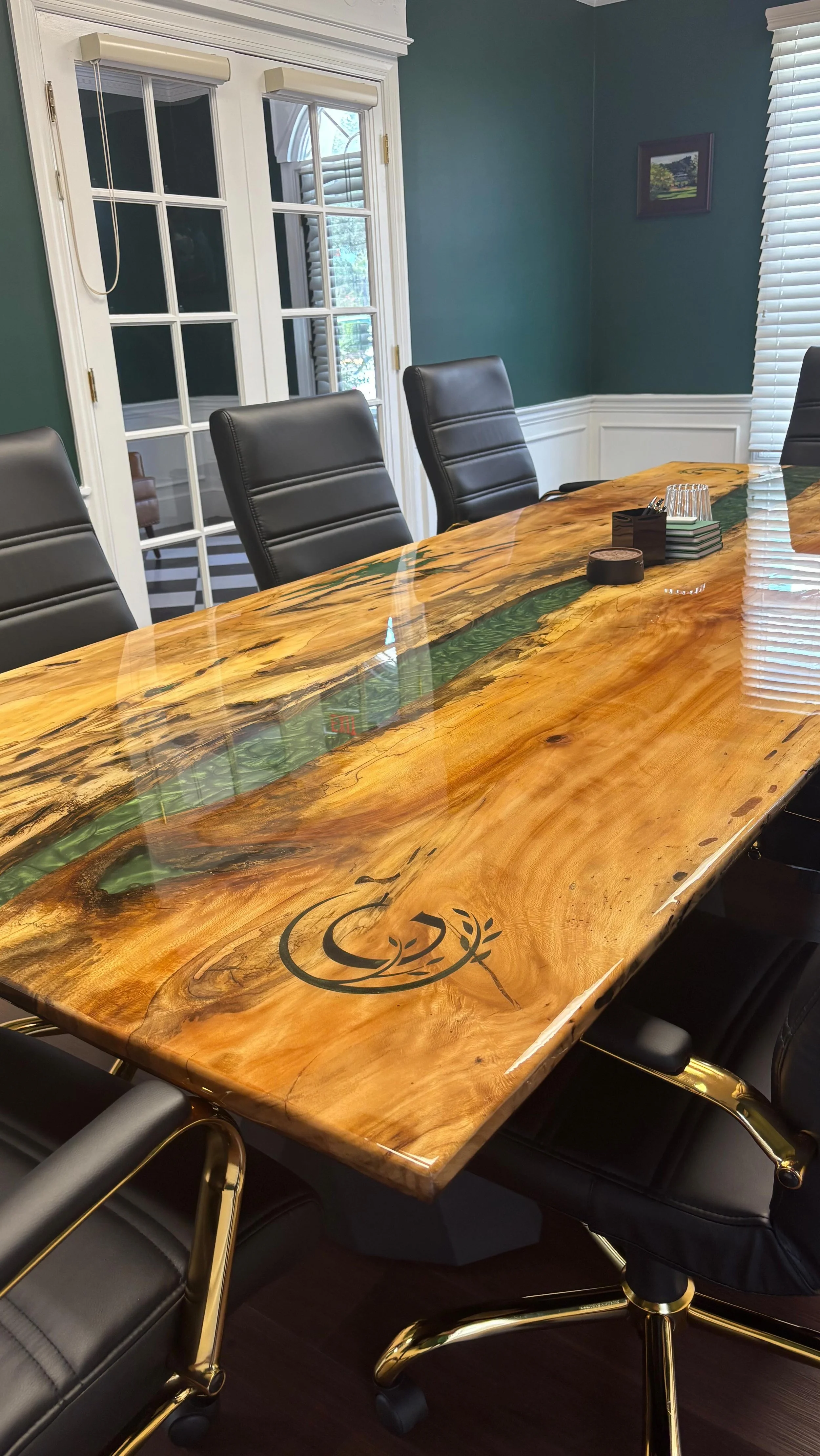 Epoxy Resin tables are created by combining wood slabs with a durable, high-gloss material called epoxy resin. This resin can be tinted in a wide array of colors, allowing for unique and vibrant patterns within the table. The process involves pouring the colored resin onto the wood surface, filling natural voids and cracks, and creating a smooth, seamless finish. This technique results in tables that are both visually striking and highly functional. At Resin & Roots, we offer a variety of epoxy colors and design techniques, allowing you to customize your table to your individual preferences.